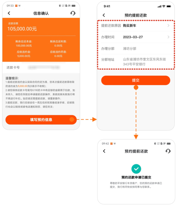 3、填写预约信息,选择到平安银行分中心的时间、原因,口袋会显示对应分中心的名称和地址,信息填写完成后点击【提交】按钮,申请完成。
