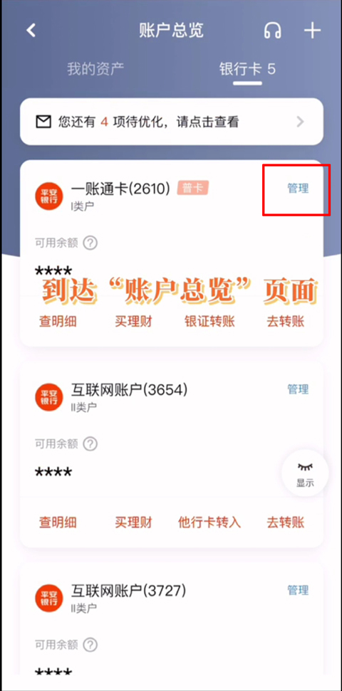 2、在打开的【账户总览】页面中点击【管理】(下图红色方框)