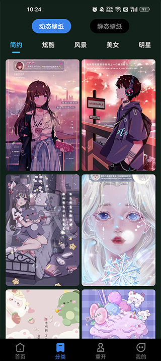 2、点击分类,分类里面有简约,炫酷、风景等多种壁纸可以选择;