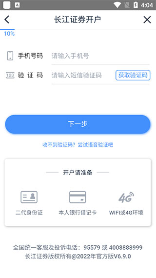 1、新用户需使用手机号进行登录,开户需准备二代身份证、本人银行借记卡、WIFI或4G环境。