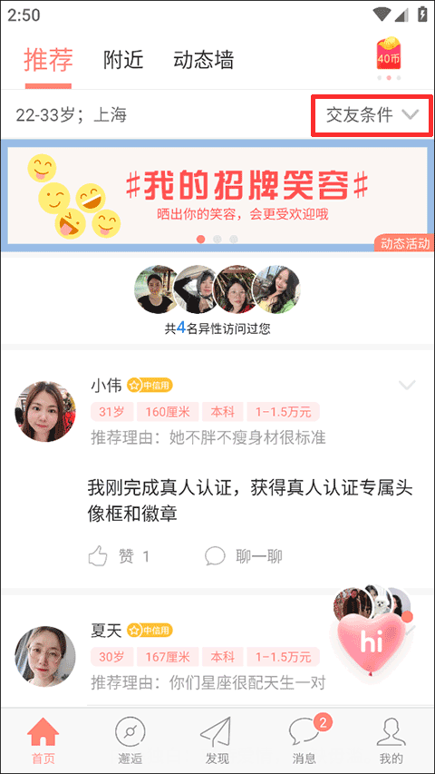 1、打开应用,在首页找到并点击“交友条件”按钮选项;