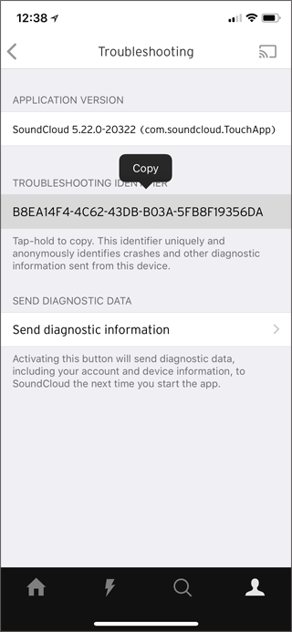 “故障排除标识符”是一个唯一的号码,可以帮助SoundCloud的工程团队通过检查SoundCloud应用程序可能产生的日志来调查任何与设备相关的问题。