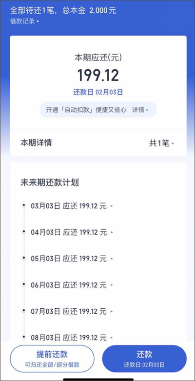 里面有您正在还款和已经结清的账单,点击对应账单,您就可以查看该账单的借款时间、每期还款时间、还款期数、还款金额、还款方式及总贷款金额等信息。