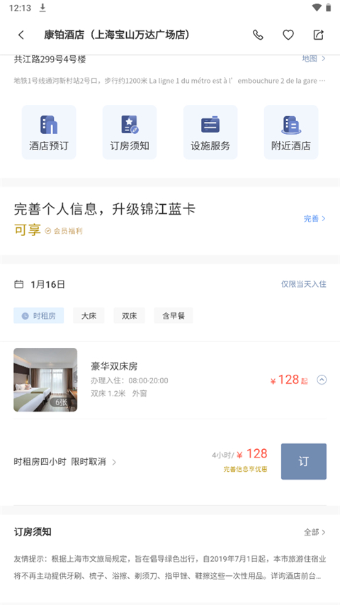 6、客房供应保证:该政策仅针对会员本人入住时提供,时间以当地中午 12 点计算。如果会员无法在线预订到客房,可联系锦江会员客服400-820-9999,由锦江会员客服联系酒店进行线下预订,具体房型、房价及政策由酒店确定,不适用免费房。