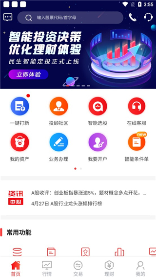 2、进入软件首页之后,这里是分为:一键打新、投顾社区、只能选股、在线客服、我的资产、业务办理、我要开户、智能条件单着八大类型;
