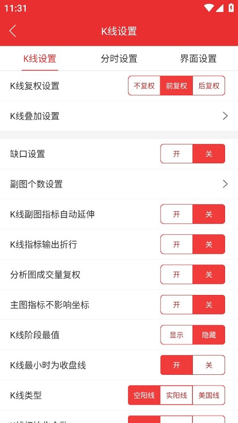 K线设置包括:K线叠加设置、缺口设置、K线副图指标自动延伸、K线指标输出折行,还有K线阶段最值、K线最小时为收盘线、K线类型等等。