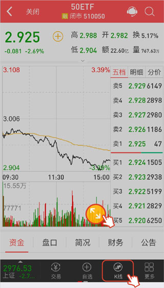 支持手机竖屏看小图,横屏看大图的自动旋转切换功能,也可通过点击分时线上的黄色圆圈。当竖屏时,行情分时线与K线图的切换可通过手指在屏幕上左右滑动,或点击下方"K线"按钮。当横屏时,行情分时线与K线图只需在屏幕左下角点击按钮切换即可。