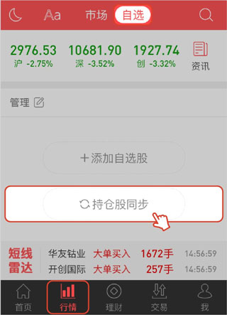 指e通行情自选股栏目除了"添加自选股"之外,还提供"持仓股同步"功能。持仓股是指已经买入并持有的股票,而自选股是指看好或者关注的股票