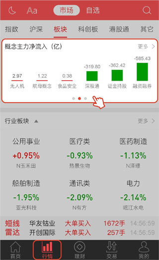 市场板块中,指e通对行业、概念、地域3个板块分别进行了可视化排列显示,将资金净流入和资金净流出的前3名板块同时合并在一个柱状图中,直观明了的让您瞬间掌握市场主力资金流向和所属板块个股的动向。