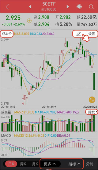 在K线图中,可设置成本价,也可设置均线及缺口,变更各类指标及相应参数,可切换除权、前复权,后复权,以及切换K线周期。