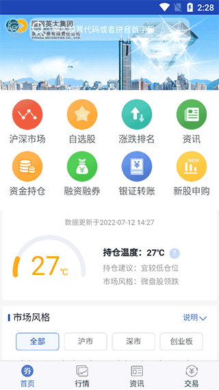 英大证券大智慧版,软件拥有沪深市场、自选股、涨跌排名、资讯、资金持仓、融资融券、银证转账、新服申购、委托交易、大盘指数、全球市场等多个栏目,完美移植了电脑版的所有特色,并对android平台进行了全面优化,让投资者能够在手机上随时随地浏览股票、快速交易等服务。
