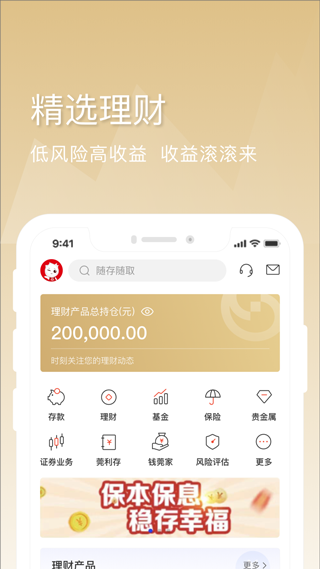 6、理财产品:在售理财,我的理财,在售滚动,我的滚动,理财明细,风险评估。