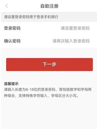 5、在“登录密码”一栏,设置手机银行的登录密码,在“确认密码”一栏,再次输入刚设置的登录密码(温馨提示:密码长度为8-18位之间,需包含数字和字母两种组合,字母要区分大小写,支持设置特殊字符),完成后点击“下一步”。