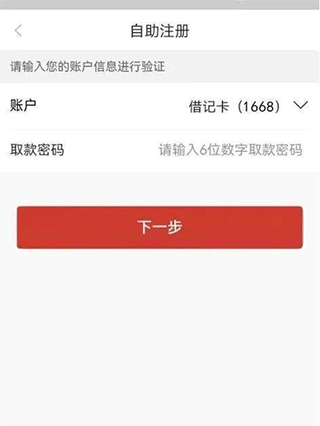 3、在“账户”一栏,选择注册人在常德农商银行开立的账户,输入相应账户的取款密码,完成后点击“下一步”。