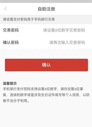 6、在“交易密码”一栏,设置手机银行的交易密码,在“确认密码”一栏,再次输入刚设置的交易密码(温馨提示:密码只能是长度为6位数的数字,且勿设置6位重复、连续的数字或是涉及生日证件尾号等个人信息),完成后点击“确认”。