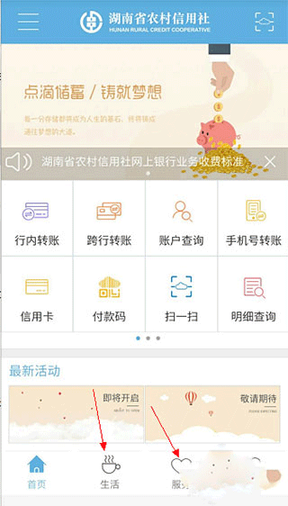 4、下图中红色箭头指的生活和服务里有手机银行的所有功能
