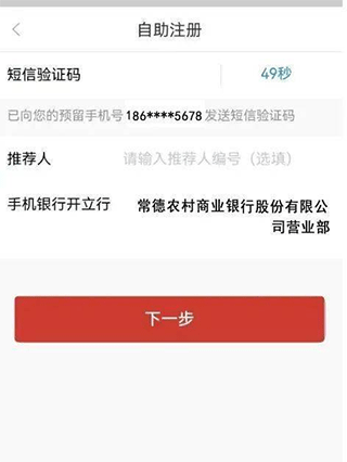 4、在“短信验证码”一栏,输入注册人预留手机号上收到的短信验证码(预留手机号必须为本人实名认证),在“推荐人”一栏输入推荐员工的工号,点击手机银行开立行,更新推荐员工对应支行,完成后点击“下一步”。