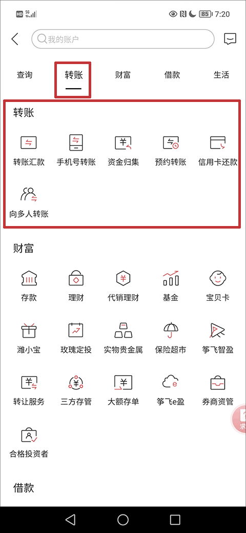 2、在“全部功能”界面的转账一栏即可对转账进行操作了;