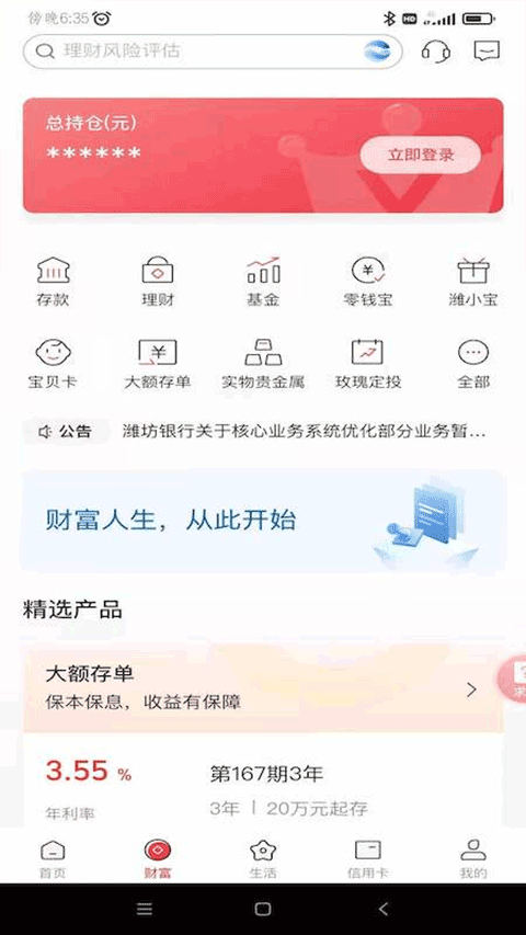 潍坊银行手机银行app是潍坊银行官网专门为手机用户提供的银行软件,通过该软件可随时随地的进行账户管理、行内转账、跨行转账、信用卡还款、全方位便民自助缴费、购买游戏点卡等服务,同时还提供自助注册、手机地图、找回密码等特色功能,方便用户操作的同时更加方便得当。目前潍坊银行app还能够提供交易对账和交易明细、账户信息查询等服务,使用手机端与数据中心点对点通讯,无需登录网络,避免了上网带来的安全隐患。另外软件还提供自助签约手机银行的服务,可以进行简单的账户查询及缴费操作,如需做动账交易可到柜面升级。用户还可查询您在我行的账户余额和交易明细以及签约了网银互联查询协议的他行账户余额,能集中管理家庭账户,账户管理一目了然。