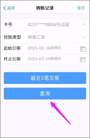 3、然后在转账记录中选择好卡号、转账类型、起始日期、终止日期后找到并点击“查询”的选项;