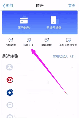 2、在转账汇款界面选择并点击“转账记录”的选项;