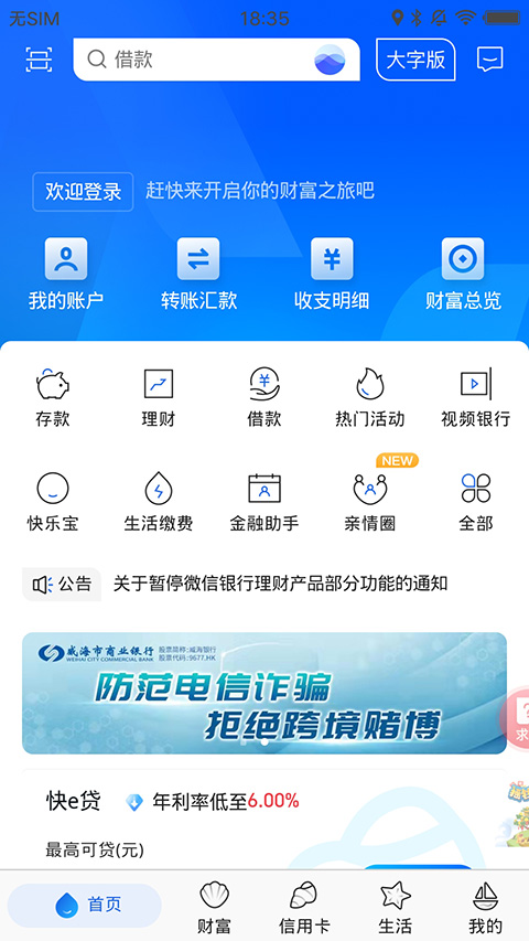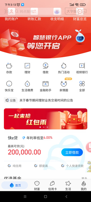 2、进入软件,在首页,有存款、理财、借款、视频银行、快乐宝、生活缴费等功能;