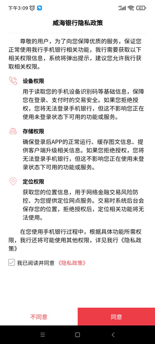 1、在本站下载安装威海银行手机银行app,运行软件,同意协议;
