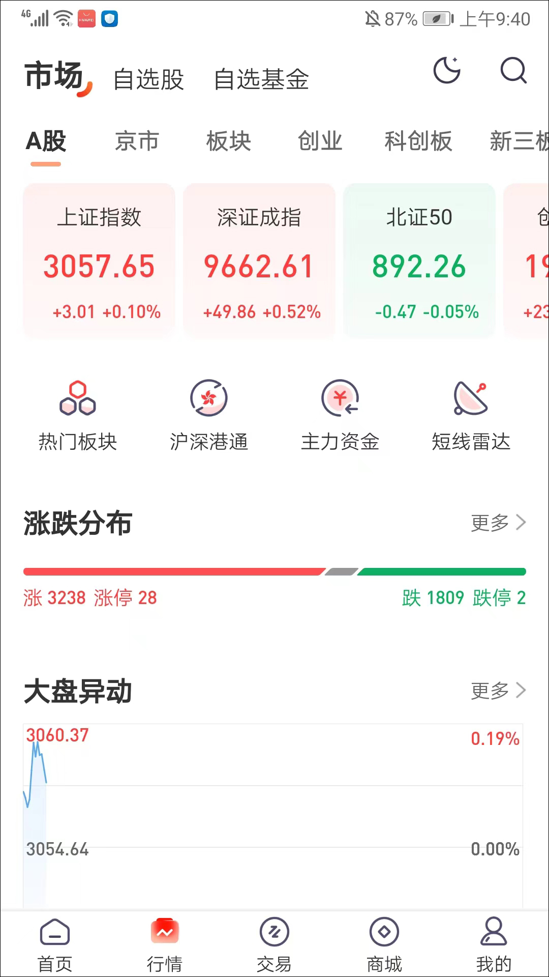 2、在行情界面,可以看到A股、创业板、科创板、新三板等板块的实时行情,还可以自选股票和基金,