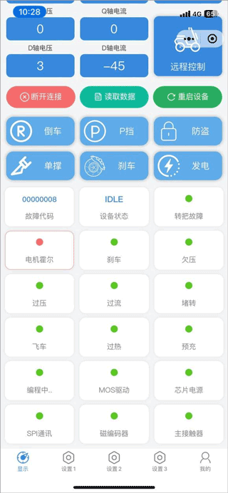 连接成功后,App主界面会实时显示设备关键参数(如电压、电流、温度、转速等)。用户可通过滑动屏幕或点击选项卡切换不同参数视图,并直接调整电机转速、弱磁值、电流保护等核心参数。