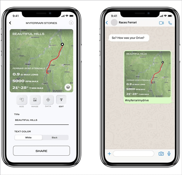 3、Ferrari Stories共享编辑器让您在社交媒体上发布旅行信息变得异常简单和轻松。您可以选择想要与朋友和关注者群体分享的内容的格式和类型,还可以访问专属法拉利图库,为您的帖子增添额外优势。