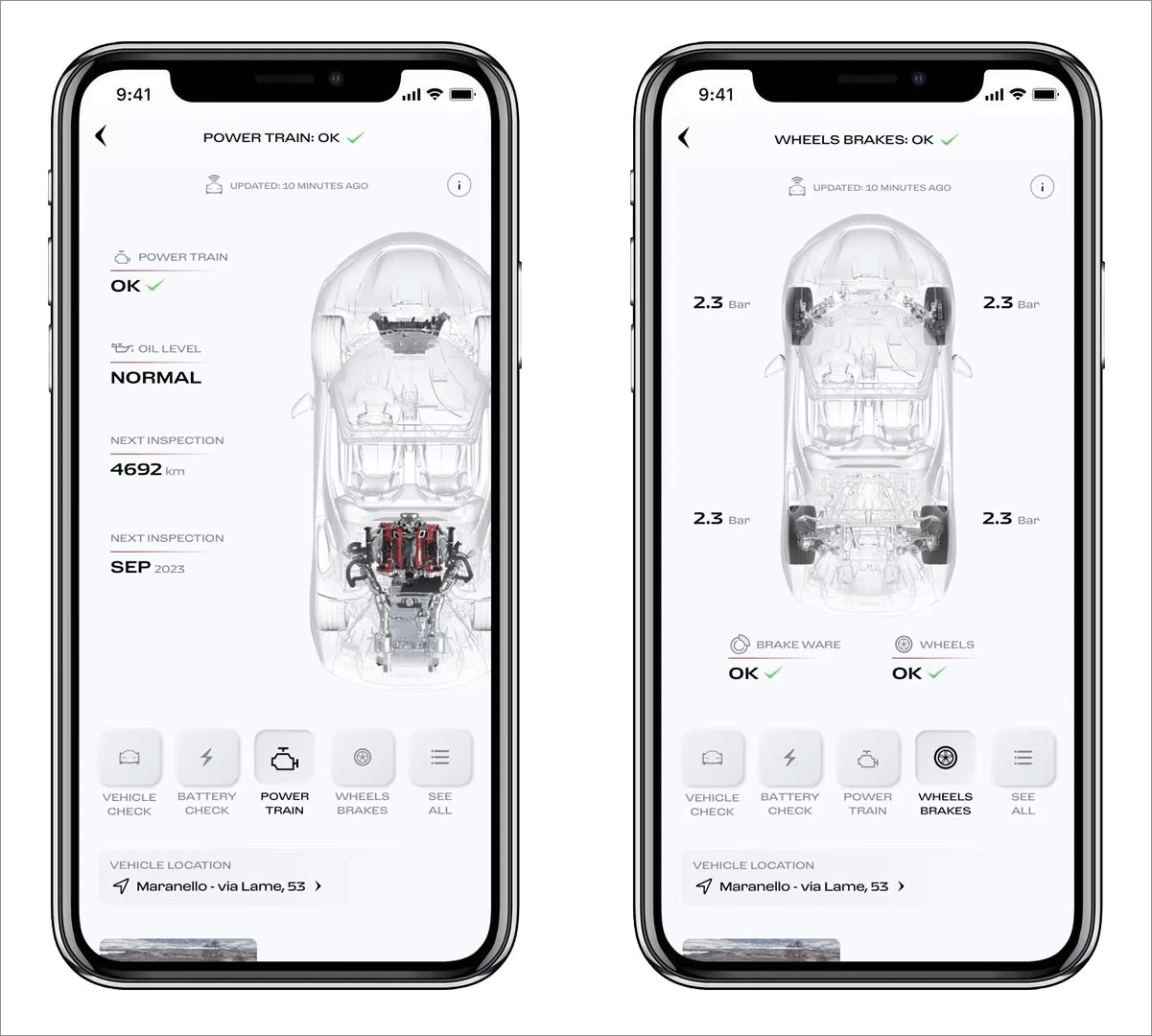 2、在"我的车库"部分中,您还可以找到有关任何潜在问题的警报、法拉利Manettino的状态、灯光、传感器和液位以及发动机、制动系统和高压电池(如果您的汽车是混合动力插电式汽车))。您还可以密切关注汽车的里程表及其最后已知位置,这将是您汽车发动机最后关闭的位置。