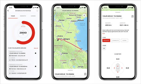 2、MyDrive统计信息可让您查看G力图形、汽车的最高速度以及每次行程的Manettino和eManettino使用数据,此外还允许您使用个性化标签来标记行程,将其划分为子类别、删除和合并您保存的行程。