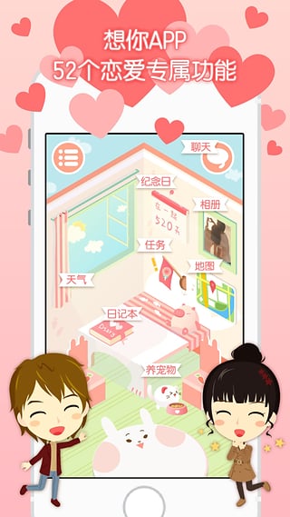 想你app是专为情侣用户研发的手机软件,用户可以利用它亲手打造一个属于你们自己的二人小家,模拟生活中的甜蜜小动作,与你的另一半亲密无间,就算相隔万水千山,我也要与你打情骂俏。不仅如此,该软件提供了小屋、窗户、日历、相册、地图、日记本、聊天等多项功能,你可以和你心爱的ta一起打扫房间,一起来做美食,一起去购买家具,助你打造专属二人的小家,让自己的小屋变得温馨起来。有需要的情侣们可下载体验,扔掉冰冷的文字和麻木的表情吧,这才是真正为情侣设计的应用!