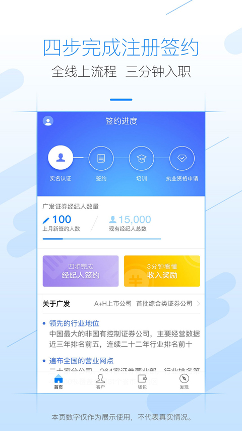 广发经纪人app是广发证券专为证券经纪人打造的一款办公服务软件,旨在帮助证券经纪人一站式完成注册签约、展业服务、客户管理及收入管理,而且支持线上全流程签约,四步即可完成签约,证券经纪人再也不用频繁跑营业部了。同时签约完成后,广发证券经纪人手机版还支持实时查看个人收入情况及收入明细,佣金收入实时计算,每笔收入一目了然。并提供在线培训课程,帮助证券经纪人提升专业素养和业务能力,更好地为客户介绍证券业务。有需要的朋友欢迎下载使用。
