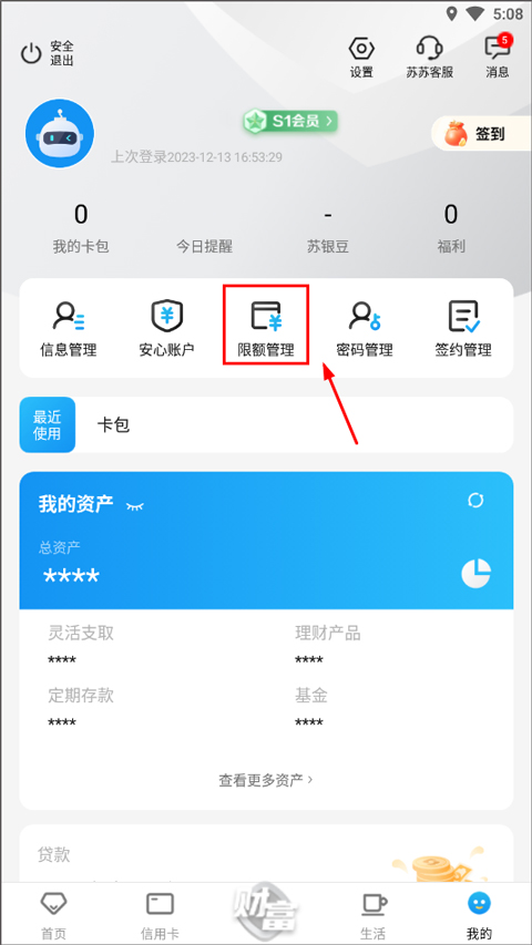 2、然后在上方即可看到“限额管理”,绑定银行卡后即可进入查看。