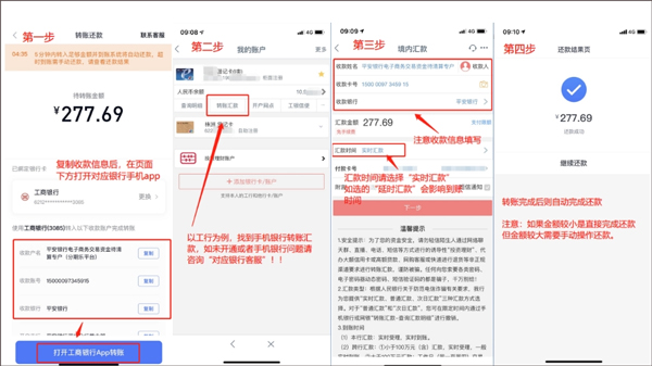 2、发起还款,转账金额≥需还款金额时,当日23:59前系统将自动还款,超时到账需手动还款,请留意还款结果通知 ;