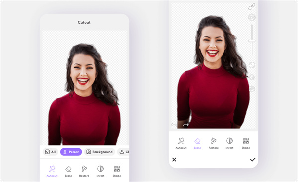 万一在使用“Autocut”后仍有一部分背景存在,您可以通过再次点击“Autocut”然后点击“Erase”来手动删除它。点击并拖动该部分以像在现实生活中一样使用屏幕上的橡皮擦。如果需要,您还可以通过拖动右侧菜单上的滑动条来调整橡皮擦的大小。