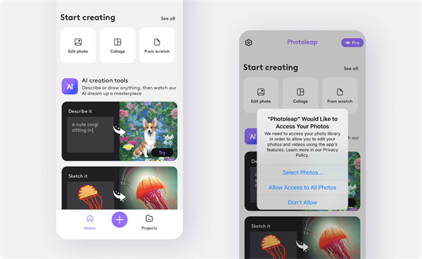 弹出窗口将询问Photoleap是否可以访问您的照片。在点击您选择的图像之前,选择“允许访问所有照片”。