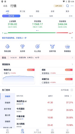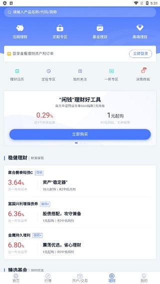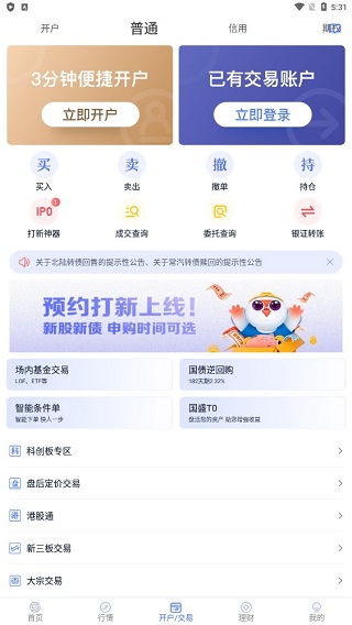 下载并安装好软件后,大致分为以下几个板块,首页、行情、开户/交易、理财和我的