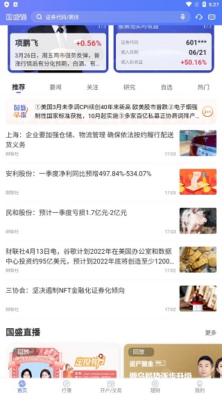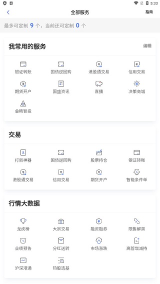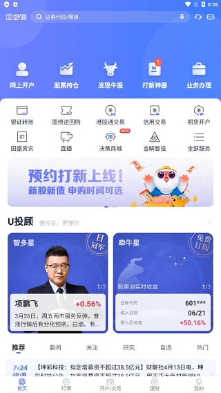 在首页基本提供了较为完善的功能,如网上开户、股票持仓、发现牛股、打新神器和业务办理等,在其下方的服务内容中,还有银证转账、国债逆回购、港股通交易、信用交易、期货开户、国盛咨询、直播、决策商城等。