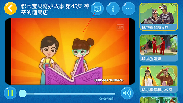 在播放页面中点击顶部的投屏图标(下图红色箭头所指)