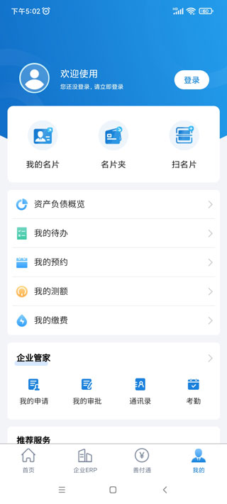 5、点开我的,有我的名片、名片夹、资产负债概览、我的待办、我的预约、我的申请等。