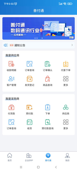 4、在善付通这里,可以看到有收款明细、订单查询、订单确认、下单、预付款、收货、商品查询等;