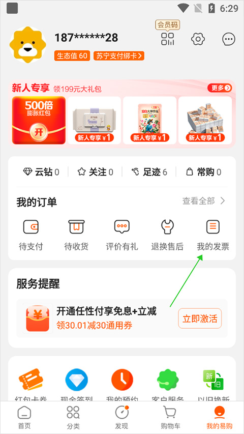 3、如果用户需要对已开具的发票需要更换时,可以进入【我的易购】页面中点击【我的发票】