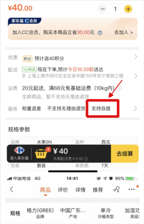 若商品服务标签显示“自提”,代表支持自提