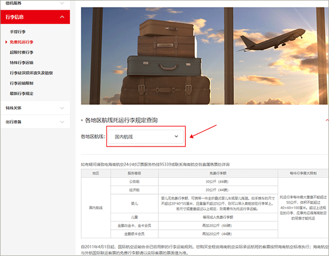 2、选择航线,即可查询免费行李托运额及尺寸要求。