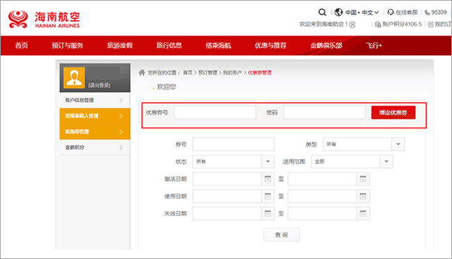 1、进入海南航空官网首页,点击导航栏中的“预订与服务”,在下拉列表中选择“会员中心”栏目下的“优惠券管理”,如下图:
