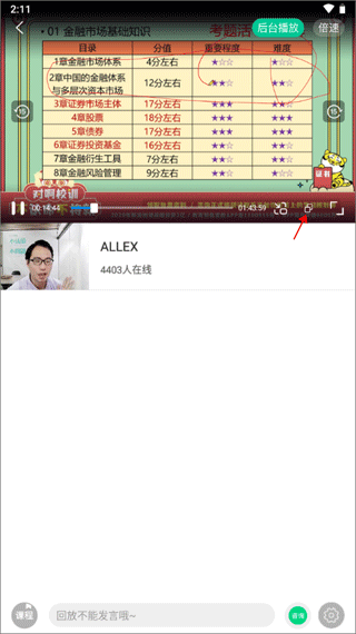 4、当你点击视频区域右下方箭头指向的地方,就可以切换到老师的显示屏上,能够直观看到课程的主要内容。