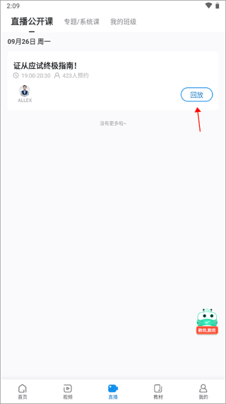 1、注册并登录软件账号,从首页切换到【直播】页面,会看到已经结束的直播回放,点击右边的回放按钮。