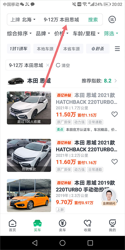 3、也可通过顶部搜索框直接输入车型或者昌价格和车型同时输入进行车辆匹配